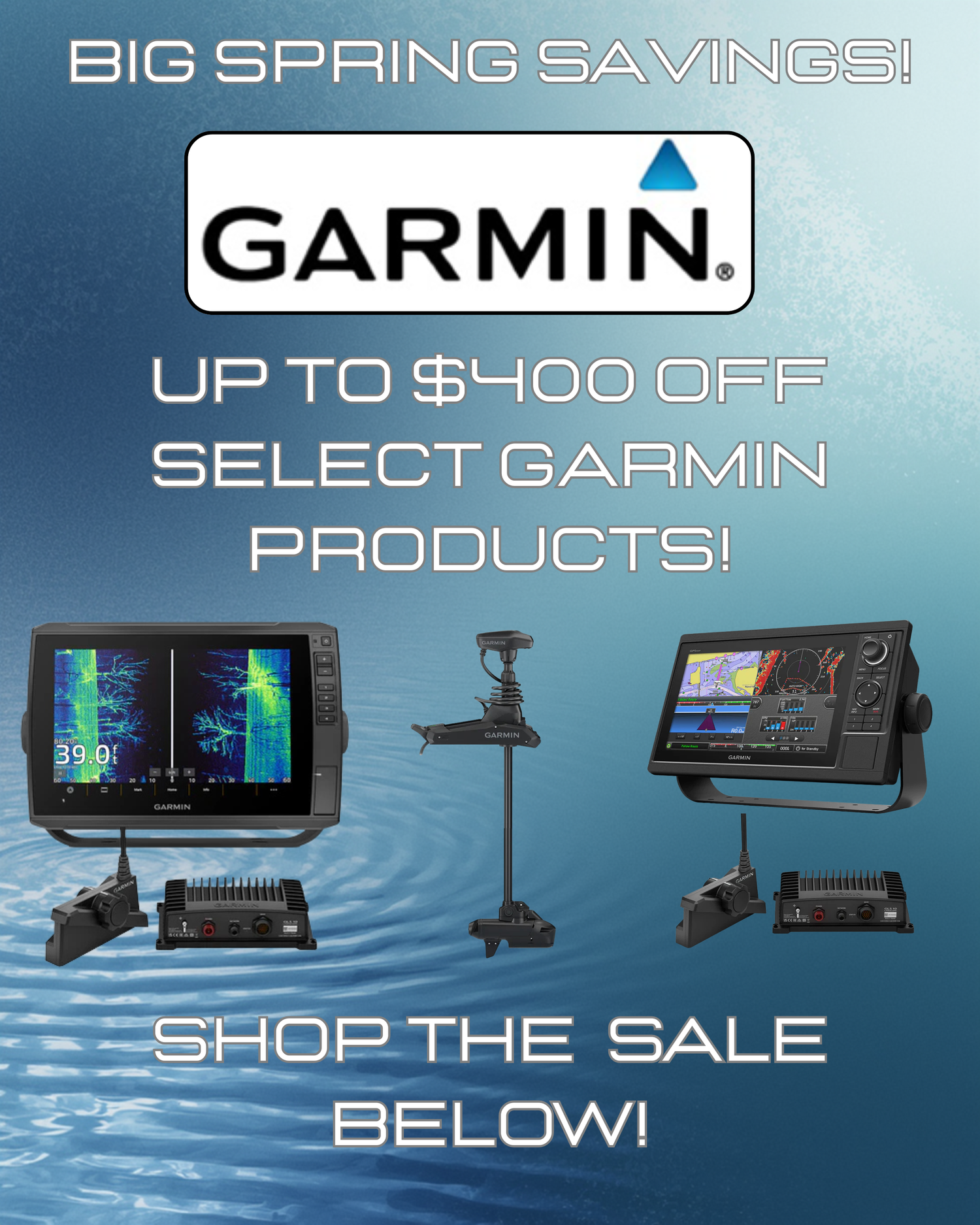 Save up to $400 off select GARMIN marine electronics, trolling motors and live imaging sonar!